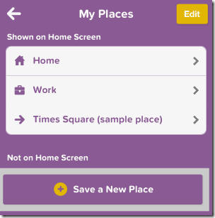 - My Places: This option lets you add those places which you visit regularly and frequently. By adding those places to this option, you can save a lot of time while finding the direction to reach this place from anywhere else. You only need to tap on the place from the list of saved locations and the app will automatically enter that location as the end point for you while finding the routes. Simply enter your start point and get the directions. After adding the locations in My Places, you can choose which locations should show directly on app’s home screen and which one inside this option.