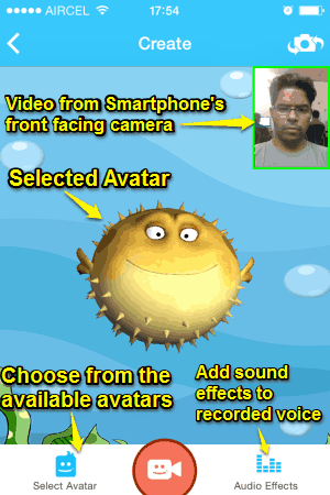 As illustrated by the above screenshot, the screen features video feed from your device’s front facing camera on the top right corner (You can use the flip switch to toggle front/rear cameras as well). Apart from that, there’s a Select Avatar option that lets you select which the avatar you want to use (All of your downloaded avatars appear here). There’s also an Audio Effects option, where you can select to apply funny sound effects to your recorded voice.