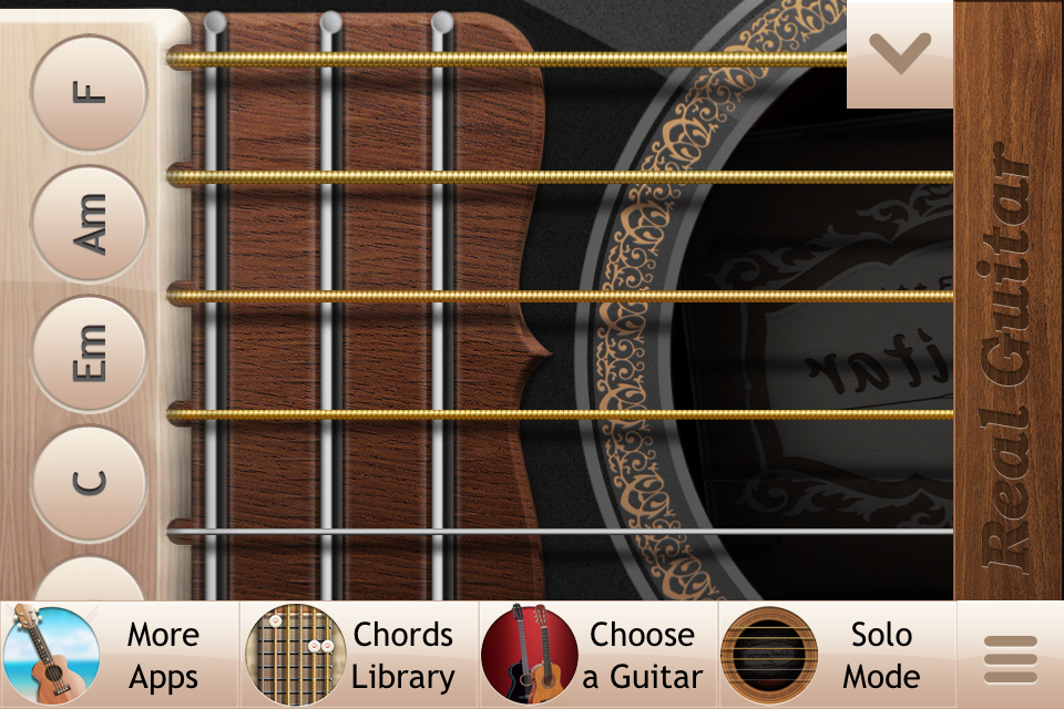 The second guitar app for iPhone is Real Guitar Free. The app has two types of guitars for you to choose: Nylon and Steel Strings. Both these guitars have two variants, one for right handed user and other for left handed users. The app has a wide collection of different chords which you can use to play the tune of your choice. You can also choose from 3 type of flatpicks for playing the guitar. The app also has feature of Solo Mode.