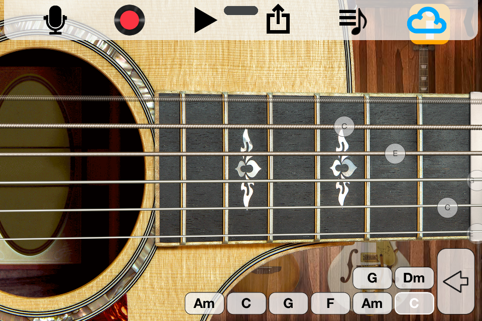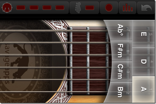 Guitar Room is the third app in the list. It provides you with 8 different types of guitars out of which 1 guitar is available for use in free version. The best feature of this app is that it syncs with popular cloud sharing website SoundCloud. This feature lets you record and share your tunes with rest of the World. You can also hear the tunes uploaded on SoundCloud by other users, rate them, and add them to your Cloud Favorites section in the app. All the tunes uploaded on the SoundCloud are categorized under following categories: Top 200, Most Recent, My Region, and Other.