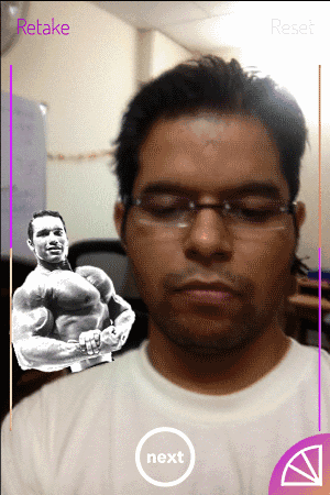 Step 3: Once you’ve made your selection, your celebrity (or any other thing, if you’ve selected that) will appear as an overlay on your selfie. You can easily resize, move, or rotate your celebrity overlay using standard iOS multi-touch gestures to your preferences. When done, click Next (to capture the image again, tap the Retake icon on the top left corner).