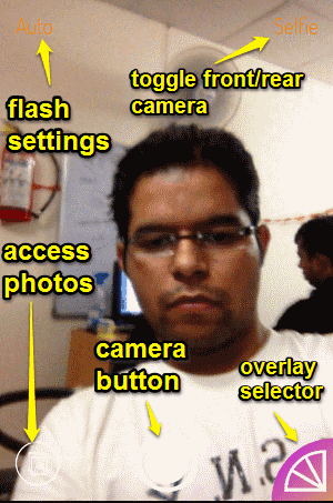 Step 1: Fire up the app, strike a best shot and press the virtual camera button to take your selfie (I guess almost everyone knows how to do that!). Once you do that, the overlay selector UI should automatically pop-up from the bottom right corner (If it doesn’t, simply tap the selector icon in the corner). Here’s how it looks like: