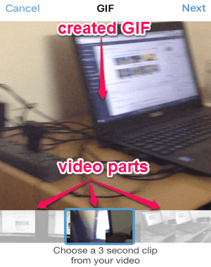 Step 3: To create a GIF, simply click the “Photo” option from the above options and choose a video from your camera roll. The GIF editor will appear and the video will be divided into multiple sections. Choose any part and turn it into a GIF automatically as shown in the first screenshot. The only catch is that you can generate GIF of only 3 seconds.