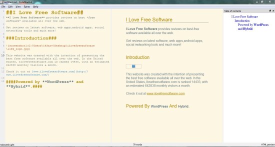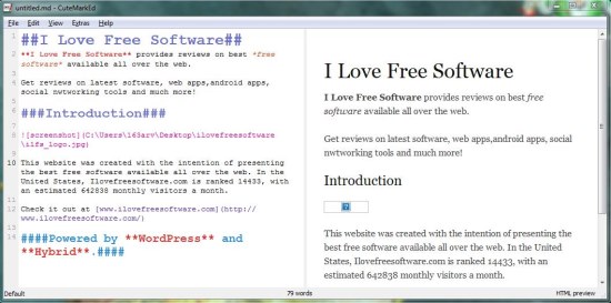 CuteMarkEd is quite easy to use. The program interface is divided into two panes: the left pane comprises of an editing window while the right pane displays HTML preview of the text you write.