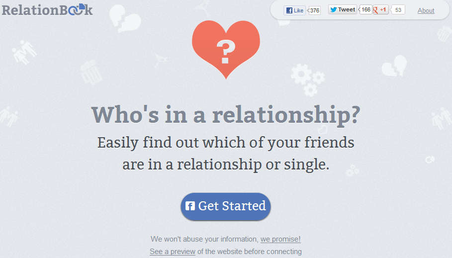 RelationBook is a great way of how you can easily find out which one of your Facebook friends is in a relationship, and which ones are single. Service is completely free, and very simple to use, if you have a lot of friends, you can use RelationBook to find out which ones exactly are available, which ones you can hit on, best of luck.