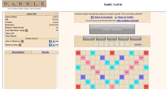Wabble is another website that you can visit to be a part of online Scrabble playing community. You can play Scrabble online on this website by creating a free account. There are lots of games being played and you can join them or merely choose to observe as audience. These games are of two types: public or private. If a game is public, anyone can join it but, a private game is password protected and you cannot join it without knowing the password. To create your own new game to play with your friend, you can hit the new game button and give password to your friend, in case you create a private game. Your game will be shown on the homepage with your name.