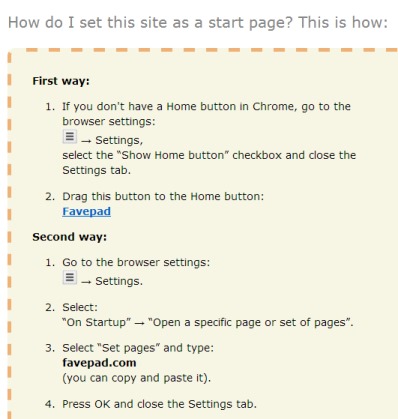 There are separate ways to set Favepad as start page for different web browsers. For example, for Firefox, you need to drag Favepad icon to home icon available next to address line. And for Google Chrome, there are two different ways that you can see in screenshot below: