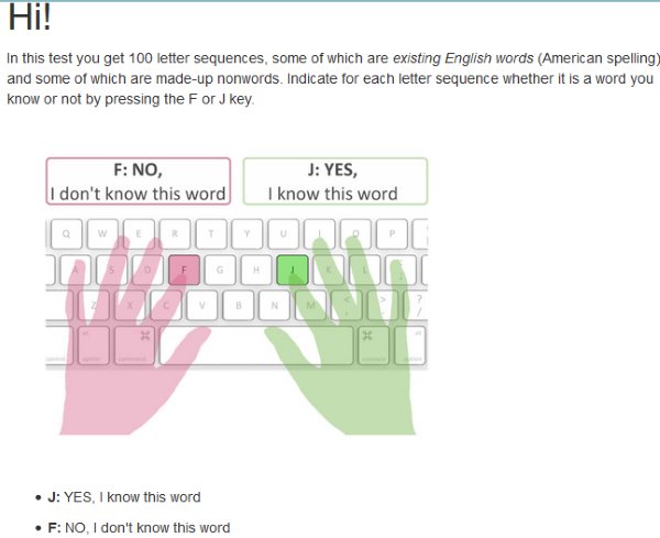 The instructions given are pretty simple. You will be shown a word on your screen, if you know the word then press J from your keyboard and if you don’t know the word then press F from your keyboard. The test takes about 4 minutes to get completed and you can take the test as many times as you want. But keep in mind that the words are not repeated. If you take the test again the words will also be changed, and you won’t be getting the same words as you got the first time.