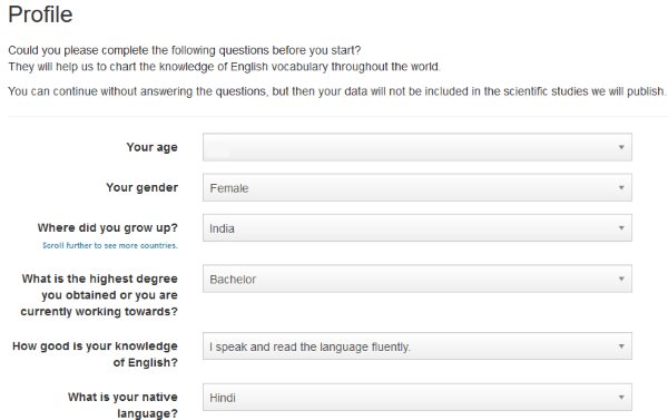 Through a series of yes or no words, this experiment can estimate the size of your English vocabulary. The data you enter will also be used for scientific studies.
