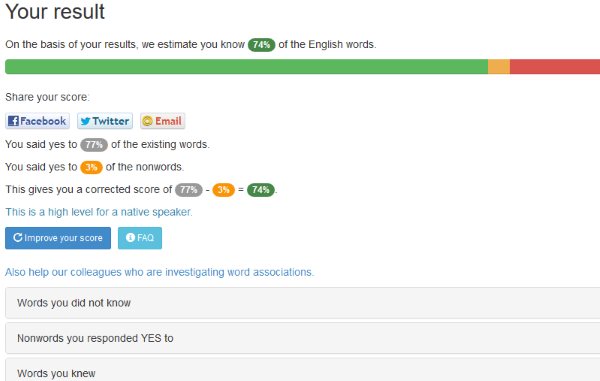 At the end of the test, you will be shown your result, which can also be seen in the screenshot above. The percentage or size of your English vocabulary will be shown at the top along with a progress bar. The green color in the progress bar indicates the right answers. You can share your results on Facebook, Twitter or via email.