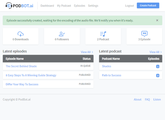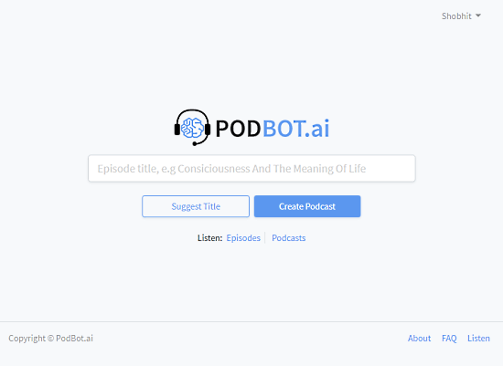 PodBot.ai is a fully-fledged podcast platform where you can publish your podcasts and have followers. You can create any number of podcasts and have any number of episodes in each podcast. People can find your podcasts on the platform and follow you if they like. The content of the podcast is not always up to the point. Sometimes, it good enough and sometimes it might be unrelated. With that said, let’s check out how this works.