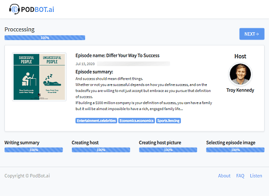 After picking up a title, when you generate a podcast, it does four things simultaneously; Writing a summary, creating a host, creating a host image, and selecting episode image. All the takes a few minutes and then shows you a preview of the podcast similar to what you can see in the screenshot attached above. The content of the podcast is fetched from the internet and then PodBot.ai generates the audio for it. As per the voice in the audio, it creates a host with a random name and image from StyleGAN neural net.
