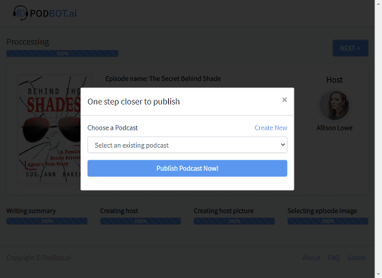 When the podcast is created, you can publish it by pressing the “Next” button. This asks you to enter a name for the podcast and then publish the generated podcast as an episode under that podcast. If you already have a podcast on the platform, you can add the generate podcast as an episode to exiting podcast as well.