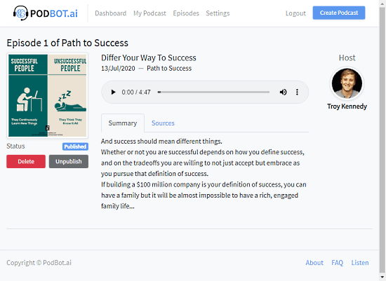 When a podcast is published, it looks like this (attached screenshot). It shows the title and number of the episode on the top along with the publishing date and name of the podcast. Below that, there is an audio section to listen to the podcast followed by a summary and sources. Left to the audio player, it shows the podcast image along with podcast status and options to delete and unpublish the podcast. The hostname and image are shown on the right side. From the audio player, users can also download the podcast as an MP3 file.