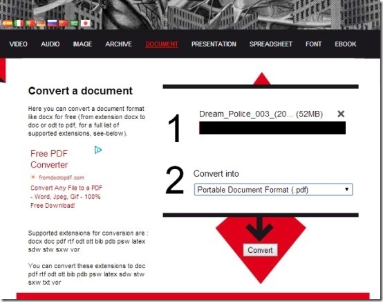 File Conversion is another online CBR to PDF converter that lets you convert comic book archive into PDF formats. To convert, simply upload the CBR file from your computer, then you just have to select the “Document” option from the menu bar. It’ll quickly redirect you to the page where you can select the PDF as output format. Then soon after selecting the output format, you can click on “Convert” button. It’ll convert the uploaded CBR file to PDF format that you can easily download on your PC.