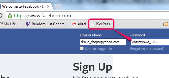 After adding its bookmarklet, open any of your website accounts whose password you want to reveal, which is saved by browser. Now just tap on ISeePass icon. It will immediately show you original password.