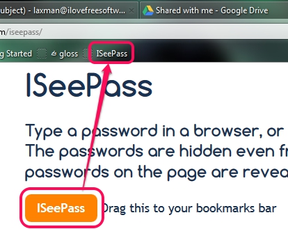 On its homepage, you will find ISeePass icon (highlighted in screenshot below). Drag this icon and drop it to bookmarks bar. If bookmarks toolbar of browser is not enabled, then first activate it, and then add this icon.