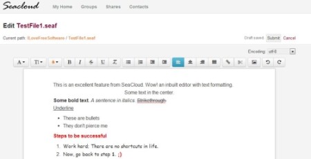 New File: SeaCloud has an inbuilt text editor and can create files in either Rich Text format (.seaf) or Simple Markup format (.md). With the Rich Text Format, you would have access to text formatting: Bold, Italics, Strikethrough, Underline and change the font type, size and color. It lets you indent the text, insert hyperlinks, images, bullets and numbered list too. In the Simple Markup Format, you would have Bold and Italics, insert hyperlink, block quotes, insert a code sample, insert an image, numbered list and bullets, heading and horizontal rule.