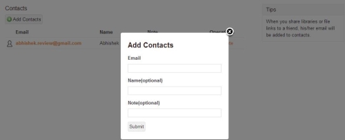 You can maintain a contact list within your SeaCloud account. Clicking on the “Add Contacts” button lets you add a new contact to the contact list. In the dialog box that appears, add the email address, name (optional) and a note (optional). A contact can be deleted or edited.