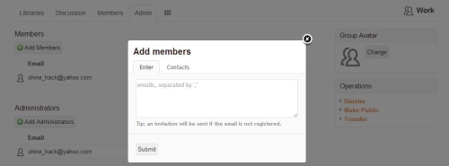 Sharing the document: You can share a library or a file with another user or a group. Users can be selected from the contact list or you can specify the user’s email address registered on the website. The Group whom you want to share the library with, can be selected from the Groups Tab.