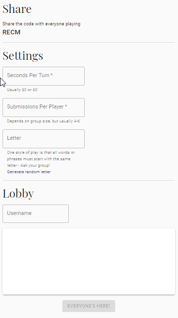 This game is played in three rounds, Charades, Password, and Taboo. The host of the game can fill out the requirements and words each player can submit in the game, in the fields given as below.