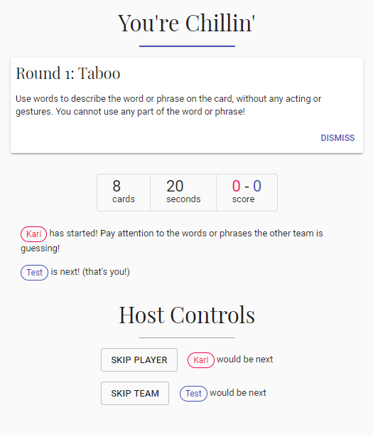 After all the players are in the lobby, the game will begin. The card will appear on the screen of the participants as their turn begin. Then, as per game rules, be it Charades, Password or Taboo, the rules will be applied and the team members will gave to guess the word on the card based on the active participant’s hints.