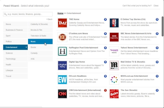 The app will display a Feed wizard from where you can easily choose from thousands of different websites belonging to different categories to add to your account. And if you don’t find the desired website listed, you can simply add it by entering its RSS URL or Website URL.