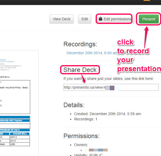 Step 2: After uploading your presentation, you can give a name to your presentation and also add a description for it. Your presentation slides are saved on the deck of your Presentious account. Now it’s your choice whether you want to share your deck or need to record the presentation. When you will share the deck, then people can only view the slides. On the other hand, recording lets you record your audio with slides, and play the presentation with its built-in player.