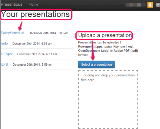Presentious is a free website to record presentation along with audio and share the recorded presentation with anyone. It generates a unique URL for recorded presentation which you can share with anyone. You can upload *.ppt, PDF, *.pptx, *.odp, and *.key format files. After this, you can start recording the presentation, speak to add your own voice in the presentation, and can finally share the presentation online.