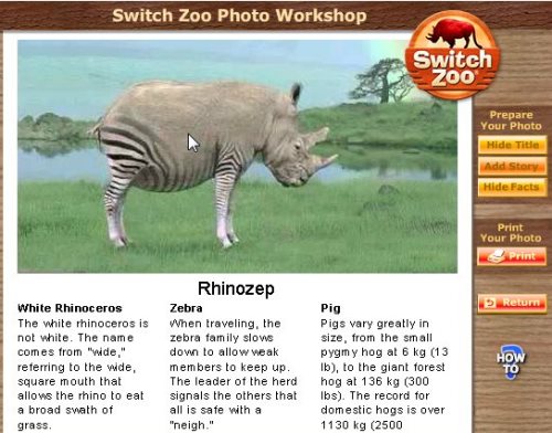 Well, I selected SwitchZoo first, because I was too excited about making a new animal. Here you will have to select an animal picture to start with. I started with a dog. Now you get options to change the head, tail and legs of the chosen animal. You will find options of both at the bottom and left side of the display screen. Keep changing until you think that the changes you made look nice. Look at the screenshot below: I made a Rhinozep, out of a Rhino, Zebra and Pig.