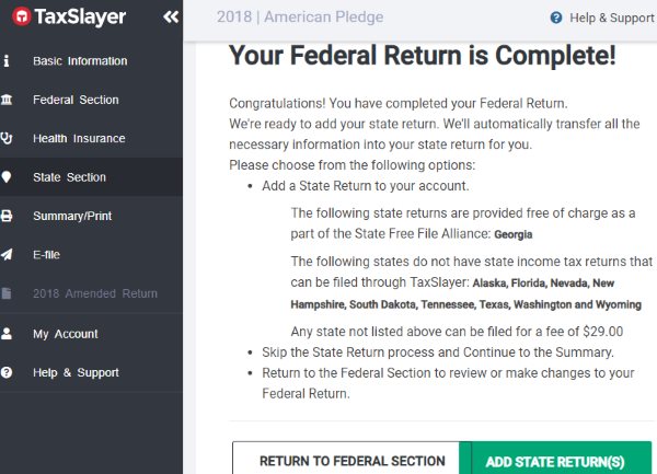 Then you will come to the federal return is complete screen. You can add a state if you have to file a state return. In this example we have selected Texas, so we do not need to fill a state tax return as Texas does not have state income tax.