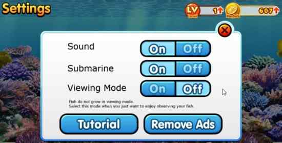 The last option is for settings, where you can turn the sound option on or off. You can also turn the submarine and viewing mode on or off.