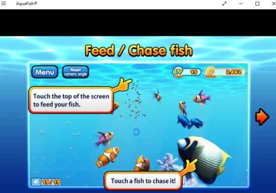 The Windows 10 fish aquarium game app can be downloaded from the Windows 10 store or from the link given at the end of this article. When you start the app, you will be shown a small tutorial on how to manage your fish. A screenshot of the tutorial can be seen in the screenshot below.