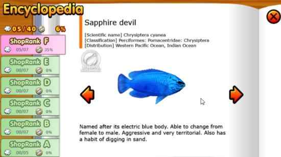 From here you can shop for new fishes, change the layout of the aquarium by changing the background or adding items to the aquarium. You can decorate your aquarium by adding various items to it from the layout tab. In the encyclopedia tab, you will be able to get more information on a particular type of fish. Entries are also made in the encyclopedia when you take care or the fish or when the fish breed, as shown in the screenshot below.