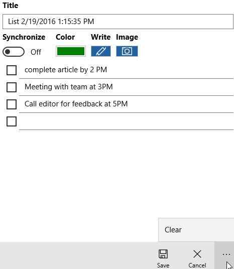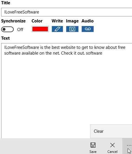 You can add a title to your note, add text, attach image, turn synchronize on or off. Turning the synchronize feature on will let you sync your notes between multiple Windows devices.