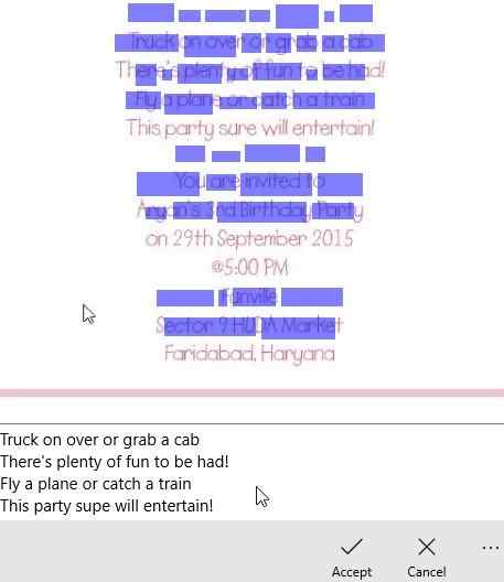 While choosing the attach a image option, you can attach a image of a scanned document as well. The app will automatically extract the text from the scanned document and convert the text into editable format. As shown in the above screenshot, the document is shown in the top part of the window and the converted text is shown at the bottom of the window. You can click the accept button to add the text to your current note.