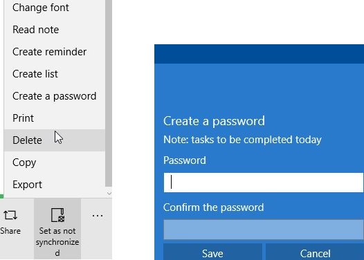 For adding password protection, open a saved note and look at the bottom right of the window. You will see a three dot icon, click on this icon and a options windows will open up like seen in the screenshot below.