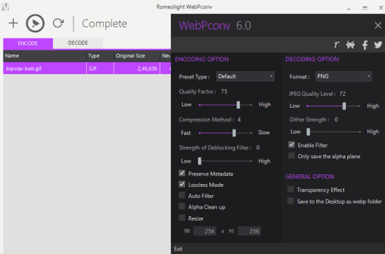 When converting images to WebP (known as Encoding in this software), it lets you set options, such as: enable lossless compression, set compression level, quality, etc. On the other hand, when you have to convert WebP to JPG, PNG, GIF, TIFF, or BMP (Decode process), it lets you set the dither strength, enable the filter, and apply transparency effect.