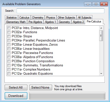 By clicking on the plus button in the bottom right corner of the interface you can open up the selector from where you can download additional problem categories, functions, equations and everything else that we mentioned. Make a selection by putting check marks next to category and then click download button down below to start the download.
