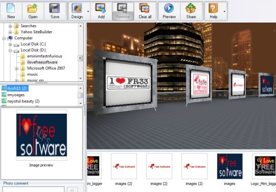 You can choose any gallery and can even install new ones. Galleries such as: Disco club, Neon maze, Lilac Symphony, pyramids, Night city, Exhibition hall, Glamorous exhibition, and many more are available to create 3D photo album. In screenshot above, you can see an example of 3D album created using Lilac Symphony template.