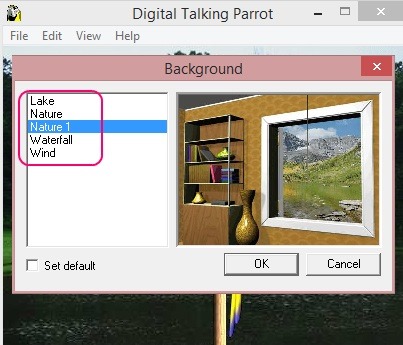 You can also change the background of the parrot. Simply click on Background option under the Edit menu, and choose desired background.