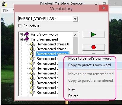 Besides the list, there are buttons to Record, Stop, Play, and Delete. Use them for recording and managing the audio files. You can also move the recorded audio files to the Parrot’s own words group, so that he repeats those words in screensaver mode. Simply right-click on the desired audio, you’ll get a context menu. Simply choose Move/Copy to parrot’s own word option.