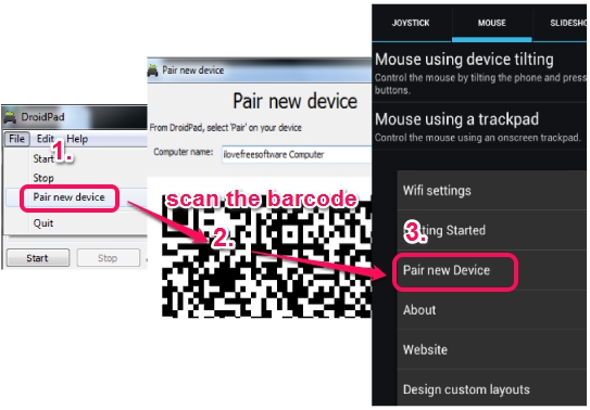 To pair devices automatically, use File menu available on its desktop client, and select Pair new device option. It will open a barcode window. You need to scan this barcode using your Android phone. For this, open DroidPad’s Android interface and click on menu button of your Android phone. It will show your Pair new Device option. Click that option and scan the barcode.