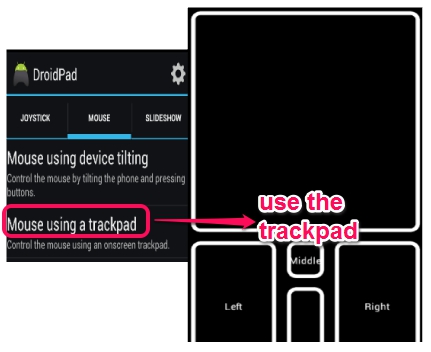 Select any option according to your requirement. After selecting an option, there will be multiple ways available to use DroidPad. For example, if you choose Mouse option, then it will provide two options: mouse using device tilting and mouse using a trackpad. Mouse using device tilting helps to move mouse cursor on PC just by moving your Android phone left to right (as a gesture). On the other hand, Mouse using a trackpad option provides a virtual trackpad with left/right/middle button and a box to move mouse cursor.