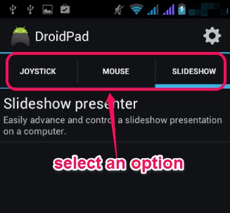 Once both the devices are connected, you can use Android as Joystick, mouse, or to control slideshow (or presentation), as visible in screenshot above.