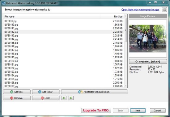 After launching the software, you can add images you want to watermark either by drag and drop, or by browsing individual image files or folder containing the desired images from your system. Bytescout Watermarking Freeware displays a small preview of the selected image on the right side, along with additional information about the image including its dimensions, resolution, and file size.