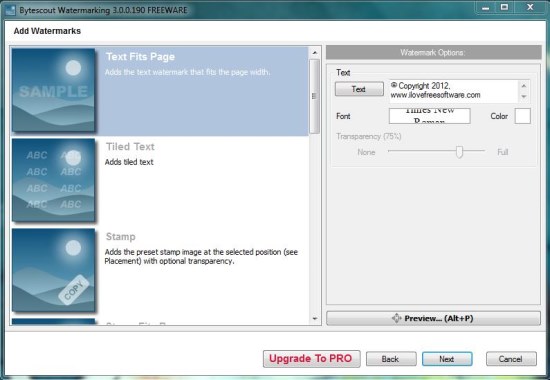 Once you add images, you can press the “Next” button to move to the second step. This will display a list of all available watermark styles on the left side. Each style has some options which you can set according to your wish. These include watermark text, font, color, position, etc. Once you set these options, you can view a full-screen preview of the watermarked image by pressing “Alt+P” from your keyboard.