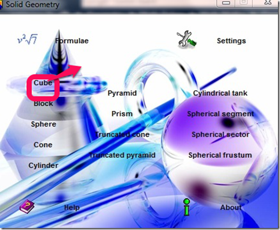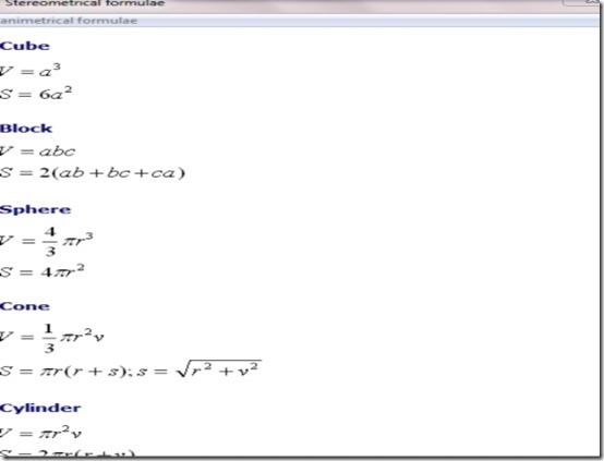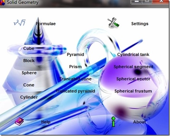 Solid Geometry is a free area and volume calculator for geometrical Shapes. Geometrical Shape that this software supports are Cube, Block, Sphere, Cone, cylinder, Pyramid, Prism, truncated cone, truncated pyramid, Cylindrical tank, spherical sector, spherical segment, and spherical frustum. It includes formula which are useful if you want to manually calculate area and volume of geometrical Shapes. You only need to start this application, just go through the various options provided and input values in this software.