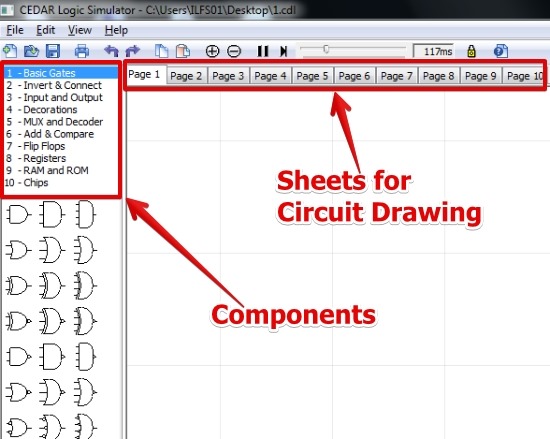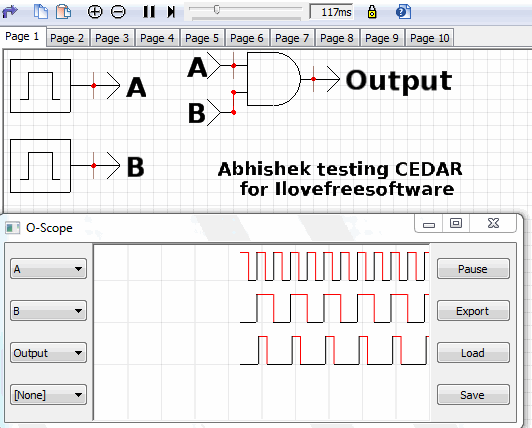 I really like the fact that CEDAR offers you up to 10 different circuit drawing sheets which you can use to design digital circuits. The simulation can be run for different sheets in single window or individually for each of circuit drawing sheet, just by switching the input of the oscilloscope . It’s a really cool feature when you are testing different circuits at the same time.