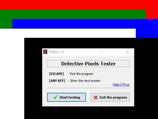 Defpix is also portable software to check for dead pixels on the computer screen. Using its tiny interface, you can Start testing, and the whole screen will be covered with red color. You can change the color either using left or right mouse button. Red, blue, green, and white colors will appear when you use mouse clicks.